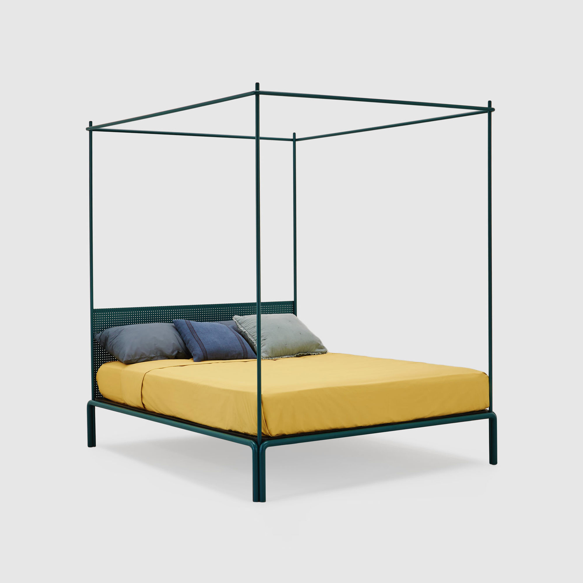 La testiera in lamiera d'acciaio forata e piegata completa il letto conferendogli un segno di grande esattezza.